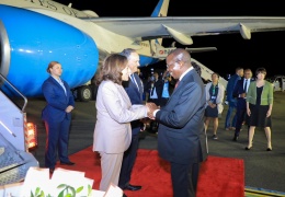 Makamu wa Rais wa Marekani, Mhe. Kamala Harris pamoja na mumewe (2nd Gentlemen), Bw. Doug Emhoff wakiwasili katika Uwanja wa Ndege wa Kimataifa wa Julius Nyerere Terminal 1 kwa ziara ya si...
