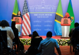 Rais wa Jamhuri ya Muungano wa Tanzania, Mhe. Samia Suluhu Hassan akiwa na mgeni wake Makamu wa Rais wa Marekani Mhe. Kamala Harris wakati walipokuwa wakizungumza na Waandishi wa Habari wa Tanzania na...