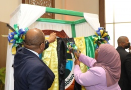 Rais wa Jamhuri ya Muungano wa Tanzania Mheshimiwa Samia Suluhu Hassan, akiwa na Rais wa Zanzibar na Mwenyekiti wa Baraza la Mapinduzi Dkt. Hussein Ali Mwinyi kwenye kukata utepe kuashiria uzinduzi ra...