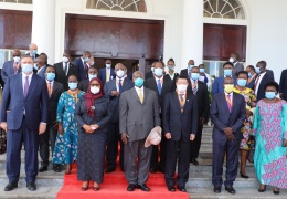 <p>wakipata picha ya kumbukumbu na  mwenyeji wake Rais Yoweri Kaguta</p>