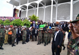 Makamanda wa Jeshi la Ulinzi la Wananchi wa Tanzania JWTZ wakiwa wamebeba Jeneza lenye mwili wa aliyekuwa Rais wa Jamhuri ya Muungano wa Tanzania katika Awamu ya tano Dkt. John Pombe Magufuli wakati w...