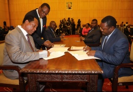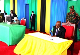 Rais wa Jamhuri ya Muungano wa Tanzania Dkt. John Pombe Magufuli na Rais wa Jamhuri ya Uganda Mhe. Yoweri Kaguta Museveni wakitia saini Waraka wa Pamoja Unaoagiza kuanza haraka mradi wa Ujenzi wa Bomb...