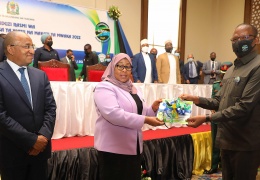 Rais wa Jamhuri ya Muungano wa Tanzania Mheshimiwa Samia Suluhu Hassan, akikabidhi Nembo ya vyeti maalum kwa Katibu Mkuu Ofisi ya Waziri Mkuu (Sera, Bunge na Uratibu) Dkt. John Jingu, kuashiria kumpa ...