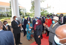 <p>Hassan akilakiwa na Waziri wa Mambo ya Nje wa Uganda Mhe Sam Kutesa</p>