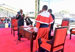 Rais wa Jamhuri ya Muungano wa Tanzania Mheshimiwa Dkt. John Pombe Magufuli akiapishwa na Jaji Mkuu wa Mahakama Kuu ya Tanzania Profesa Ibrahim Hamis Juma kuwa Rais wa Jamhuri ya Muungano wa Tanzania ...